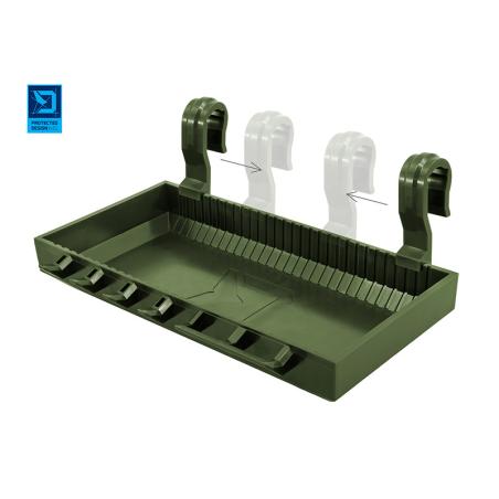 Z przodu znajdują się również haczyki do zawieszenia sprzętu. Mogą być używane do igieł, nożyczek lub innych małych elementów. Wyjmowane przegrody pozwalają zoptymalizować przestrzeń do przechowywania w zależności od potrzeb. Półka została zaprojektowana w subtelnym wzorze Camo, aby wtopić się w otoczenie.
