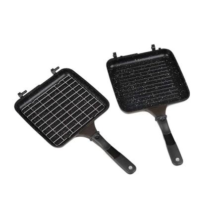 Cookware Multi-Pan – 198 mm x 185 mm x 45 mm, Jedna gładka połowa – głębokość 22.5 mm, Jedna patelnia grillowa – głębokość 22.5 mm.
