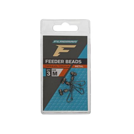 Flagman Feeder Metal Beads to wysokiej jakości łącznik z agrafką na metalowej podstawie, przeznaczony do montażu przelotowych zestawów z koszykiem. Metalowa ślizgowa podstawa krętlika nie uszkadza żyłki głównej. Dzięki kształtowi agrafki rośliny mniej zaczepiają się o zestaw podczas łowienia. Ten element wyposażenia można stosować we wszystkich typach przelotowych zestawów feederowych z koszyczkami lub ciężarkami.
