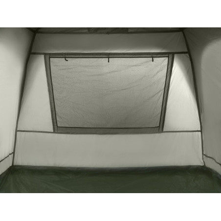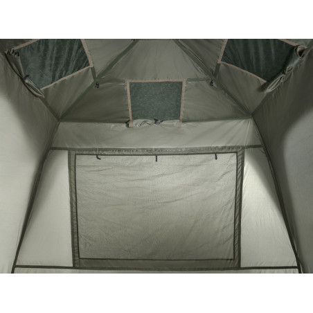 Kolejną dużą zaletą jest rozbudowany system wentylacji, który składa się z kilku okien i osłony. Obszerna moskitiera umieszczona jest zarówno na przedniej, jak i tylnej ścianie, a cztery mniejsze okna znajdują się bezpośrednio w suficie namiotu. Dzięki temu powietrze może przepływać do środka, gdy nie możesz przewietrzyć całego namiotu za pomocą dużych okien. Z pewnością docenisz to w nocy, kiedy pomoże to zmniejszyć skraplanie się pary wodnej na wewnętrznych ścianach. Daszek nad wejściem stanowi dodatkową ochronę przed słońcem i deszczem. Dach jest przymocowany do całej konstrukcji za pomocą szeregu klipsów, aby uniknąć niepotrzebnych ruchów spowodowanych wiatrem. CUBICON posiada również 4 stabilizujące linki i kołki w pakiecie, a także standardową podłogę mocowaną za pomocą wysokiej jakości zamka błyskawicznego na całym obwodzie. Koniec z brudem i niechcianymi wizytami gryzoni!
