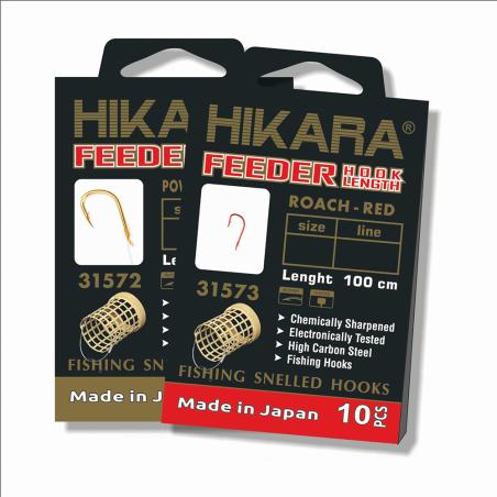 Przypon HIKARA Feeder to najwyższa japońska jakość haczyków oraz żyłki stawia ten produkt w czołówce na rynku wędkarskim. Haczyki wykonane są z najwyższej jakości stali wysokowęglowe, dzięki czemu są bardzo ostre i wytrzymałe. Bardzo elastyczna i wytrzymała żyłka o długości 1 metra umożliwia wykonanie przyponu o optymalnej długości. W ofercie znalazły się najlepsze modele haków, które możemy dopasować do różnych rodzajów przynęt i gatunków ryb.