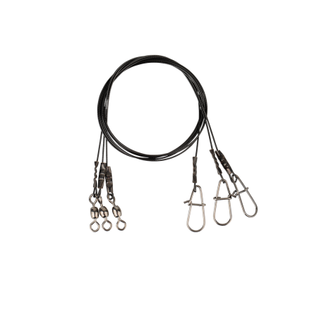 Bardzo mocny przypon ze stali nierdzewnej, pokryta mocnym czarnym kopolimerem, dla doskonałej odporności na ścieranie! Idealny krętlik i agrafka ze stali, do twardych lub miękkich przynęt! Doskonały do łowienia szczupaków!