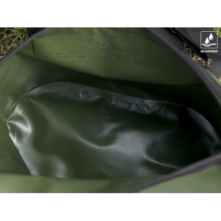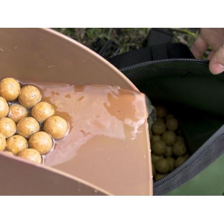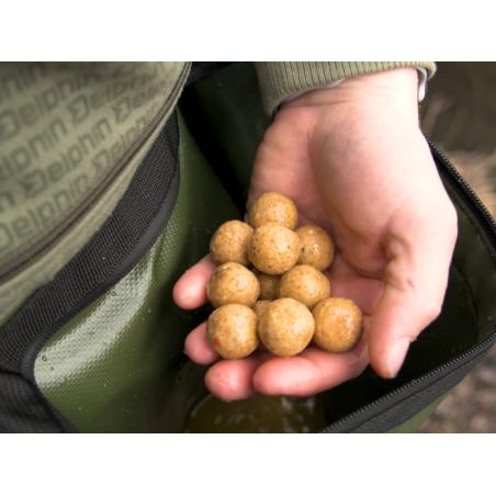 Dzięki wodoodpornym materiałom można bezpiecznie przechowywać wstępnie namoczone lub dociążone kulki proteinowe bez obawy o wyciek. Przednia część torby jest wyposażona w gumową pętlę na procę lub rurę zanętową. Pasek o regulowanej długości z solidnym klipsem mocującym zapewnia bezpieczne dopasowanie do talii.