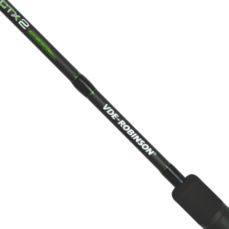 Seria wędzisk VDE-ROBINSON Competition Method Feeder CTX2, które zostały zbudowane na tym samym blanku co legendarny model TX3. Nowa odsłona zawiera tak jak poprzednio, trzy dwuskładowe wędki o długościach 3,00m, 3,30m oraz 3,60m. Takie parametry pozwalają idealnie dobrać wędzisko w zależności od odległości łowienia. Wszystkie kije wyposażone są w uchwyty kołowrotków Fuji, powiększone przelotki typu K-Koncept a na spigocie zastosowaliśmy dodatkowy karbonowy oplot. Sporo zmian pojawiło się również w szczytówkach. Zwiększyliśmy ilość przelotek z pięciu na sześć, wzmocniliśmy ostatnią przelotkę i zastosowaliśmy malowanie typu dwu-kolor. Dzięki temu sygnalizacja brania jest jeszcze lepsza, a sama widoczność szczytówki na tle wody została mocno poprawiona. Wędki w komplecie posiadają trzy węglowe szczytówki o mocy 0,75oz, 1,00oz oraz 1,50oz. Opcjonalnie można dokupić szczytówkę 0,50oz lub 2,00oz. Tak jak poprzednia seria, CTX2 charakteryzują się szybką akcją oraz progresywnym ugięciem, minimalizując ryzyko utraty ryb. Wędki mają spory zapas mocy, a przy zachowaniu bardzo smukłych blanków nadają się zarówno do łowienia naprawdę dużych, jak i tych średnich oraz małych ryb.