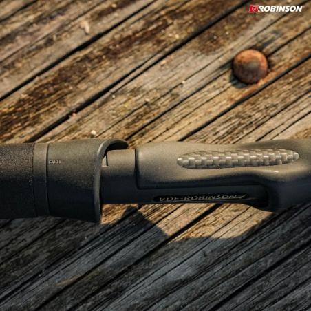 Seria wędzisk VDE-ROBINSON Competition Feeder CTX2, które są zbudowane niemal na identycznych blankach jak seria Method Feeder CTX2, z jedną zasadniczą zmianą – wszystkie te w wędki są trójskładowe, zapewniając bardziej kompaktowe wymiary transportowe. Seria Feeder CTX2 składa się z sześciu wędzisk. Dwa najkrótsze polecamy do łowienia na bliższych odległościach lżejszymi zestawami, a kolejne modele idealnie sprawdzą się do cięższych zadań i większych ryb. Tak szeroki zakres parametrów pozwala idealnie dobrać wędzisko w zależności od warunków panujących na łowisku. Cała seria została wyposażona w uchwyty kołowrotków Fuji, powiększone przelotki typu K-Koncept a na spigocie zastosowaliśmy dodatkowy karbonowy oplot. Na uwagę zasługują również szczytówki. Wyposażone są one w sześć przelotek, z czego ostatnia jest dodatkowo wzmocniona, a zauważenie najdelikatniejszych brań ułatwia malowanie na tzw. dwu-kolor. Wędki w komplecie posiadają trzy węglowe szczytówki o mocy 0,75oz, 1,00oz oraz 1,50oz. Opcjonalnie można dokupić szczytówkę 0,50oz lub 2,00oz. Feedery CTX2 charakteryzują się szybką akcją oraz progresywnym ugięciem, minimalizując ryzyko utraty ryb. Wędki mają spory zapas mocy, a przy zachowaniu bardzo smukłych blanków nadają się zarówno do łowienia naprawdę dużych, jak i tych średnich oraz małych ryb.