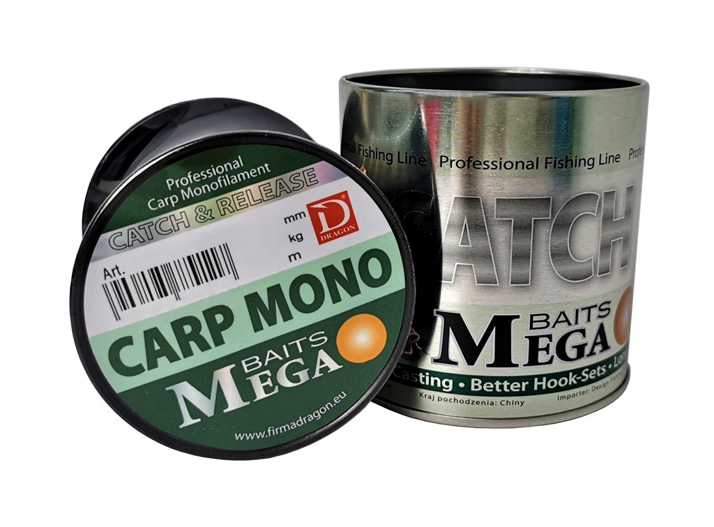 Żyłka Dragon Mega Baits CARP MONO Kamuflażowa żyłka przeznaczona do połowu karpi. Indywidualnie opracowany kolor, stanowiący mieszankę kilku odcieni zieleni, brązów i koloru czarnego. Podstawowe cechy tej żyłki to: podwyższona odporność na uszkodzenia mechaniczne, zmniejszona w stosunku do standardu rozciągliwość oraz ograniczona do minimum pamięć kształtu. Dzięki zabezpieczeniu powierzchni przed działaniem czynników zewnętrznych (zanieczyszczenia wody, promienie słoneczne) MEGA BAITS Carp Mono przez kilka miesięcy intensywnego użytkowania potrafi zachować do 95% bazowej wytrzymałości liniowej i na węźle.